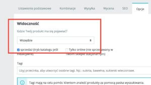 Jeżeli zmienimy jego widoczność na jedną z opcji „Tylko wyszukiwanie” lub „Nigdzie”, produkt będzie dostępny tylko podczas wyszukiwania w sklepie i dla ludzi trafiających do niego bezpośrednio (chociażby z wyszukiwarki Google), lub przy opcji „Nigdzie”, tylko dla tych drugich.